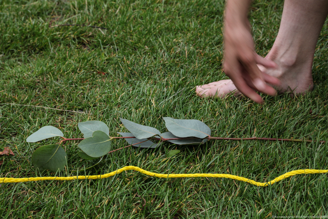 Shiva Shakti came to the rescue with her microphoned headset and little bell, escorting us to the next act, entitled be graceful in the wind. The audience was led around a piece of yellow tape encircling a tree next to the water’s edge. The view from this site was spectacular, with the buildings of downtown and the iconic red cargo cranes of Vancouver’s downtown port just behind. Three ladies, including dancer and choreographer Meghan Goodman and dancer Susan Kania appeared dressed as forest sprites and began laying cedar boughs down along the interior of the circle, acknowledging curious onlookers as they prepared the space in ritual. Dancer Julia Carr then re-entered with a thurible, a brass instrument on a long chain easily recognized from a church setting that holds and burns incense during mass. She gently followed the pendulum swinging around her body, mirroring the circular formation of the audience in a Ptolemaic spiral around the perimeter leaving a trail of smoke that filled the air with the perfumed aroma of sage.