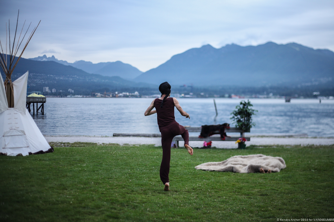 Next we were led to the set of Cree Creation Story, where a bearskin was laid along a park bench in an altar comprised of flowers, deer hide, racoon fur, and stones. The audience faced north toward a full view of the North Shore mountains, Cypress, Grouse and Seymour, a stunning sight to compliment a traditional style tipi that had been set up next to the furs. A voice recording of Métis elder Tom McCallum began telling the story of the beginnings of time from the Cree perspective, or Cihcipcikwan as it is known in Cree language, over the loud speaker. The voice beckoned four dancers who emerged from the tipi to sounds of songbirds and crows cawing, giving way to a single drum beating in the rhythm of a heartbeat. The dancers followed in a contemporary round dance, each uniquely clothed in complimentary colors, some with moccasins, one with a fur coyote skin worn on the head.